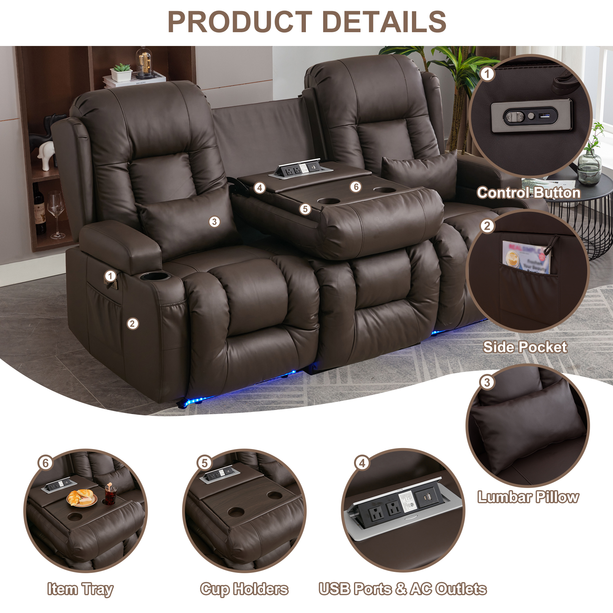- LED AMBIENT LIGHT & MORE SEAT: Home Theater Seating’s adjustable LED strip lights up for you at any time, which not only adds a sense of ambience, but also makes it easy to find your exclusive theater chair in the dark, with different colors creating different atmospheres, making every experience unique. And the center console that comes with more seat, it can be used as a three-seater or as a center console