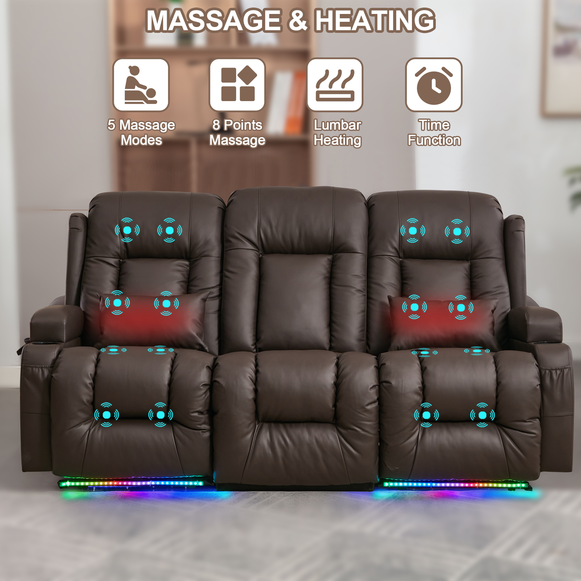 TUNYI Power Loveseat Recliner Sofa with Massage & Heat Home Theater Seating with Console Electric Recliner RV Sofa with USB/Outlet/Cup Holder/Side Pocket/LED Light (Brown, 3 Seat)